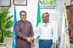 L-R: Professor Charles Anosike, Director-General/Chief Executive Officer of NiMet and Dr. Tufa Dinku, Research Scientist with the International Research Institute for Climate and Society (IRI), part of the Columbia Climate School at Columbia University, during the visit to Prof. Anosike in his office in Abuja On Monday.